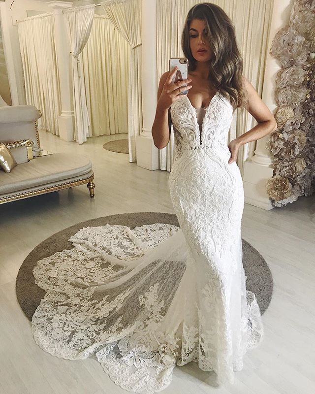 Gorgeous Mermaid V Neck Open Back White Lace Wedding Dresses