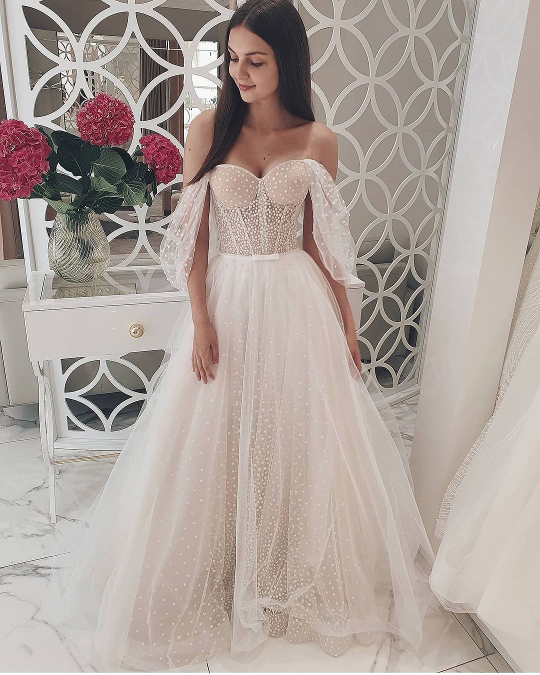 Fairy Sweetheart Long Sleeves White Dot Tulle Wedding Dresses for 2021