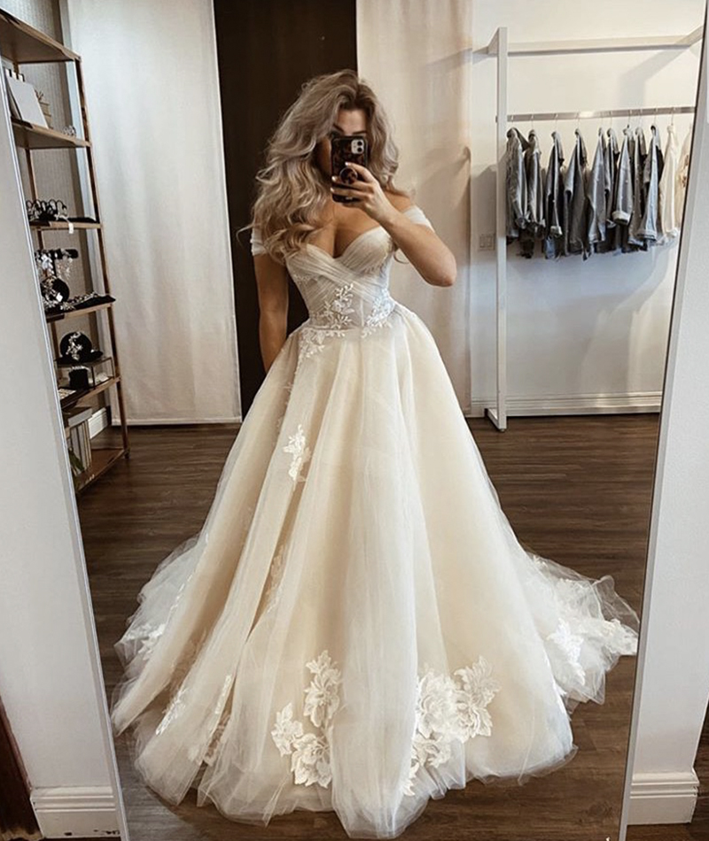 Off the Shoulder Ivory Tulle Wedding Dresses with Lace Appliques Bride Dresses