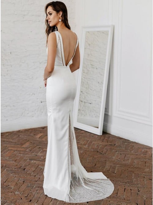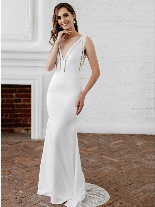Whtie Sheath Sleeveless Beading Sweep Train Wedding Dress With V-Neck