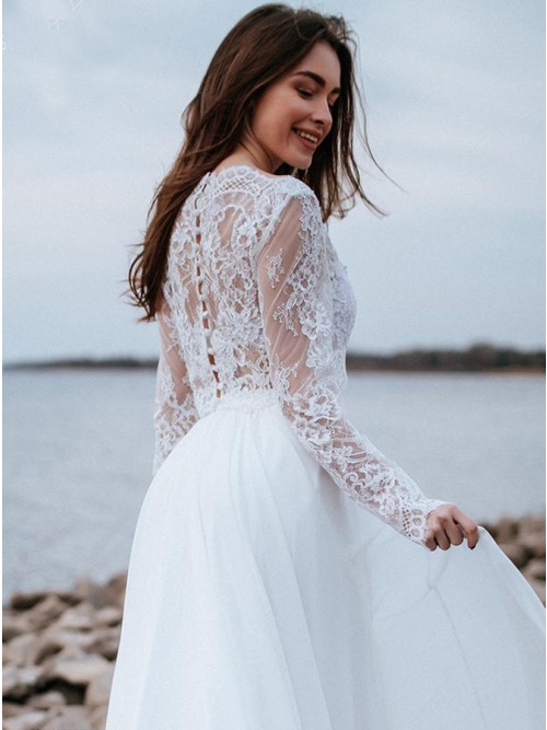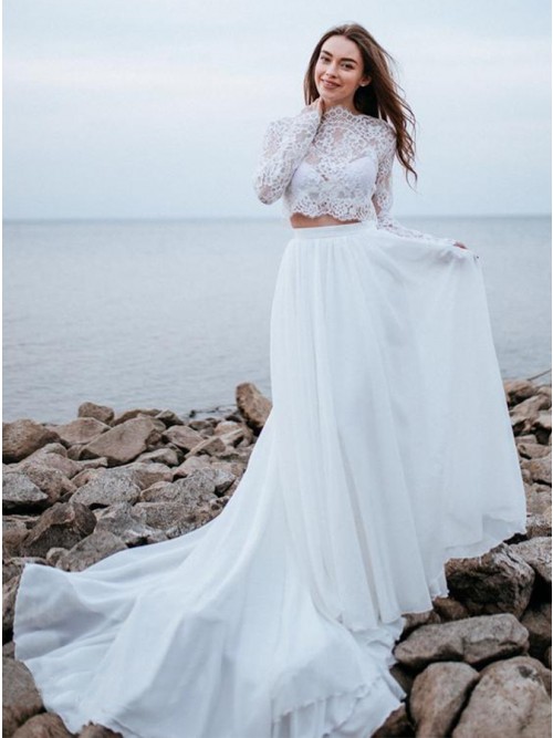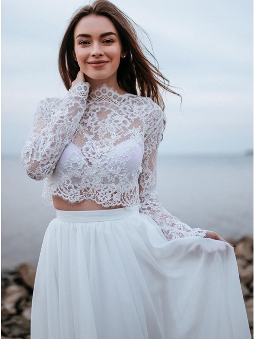Boho Two Piece Long Sleeve Lace Beach Wedding Dresses