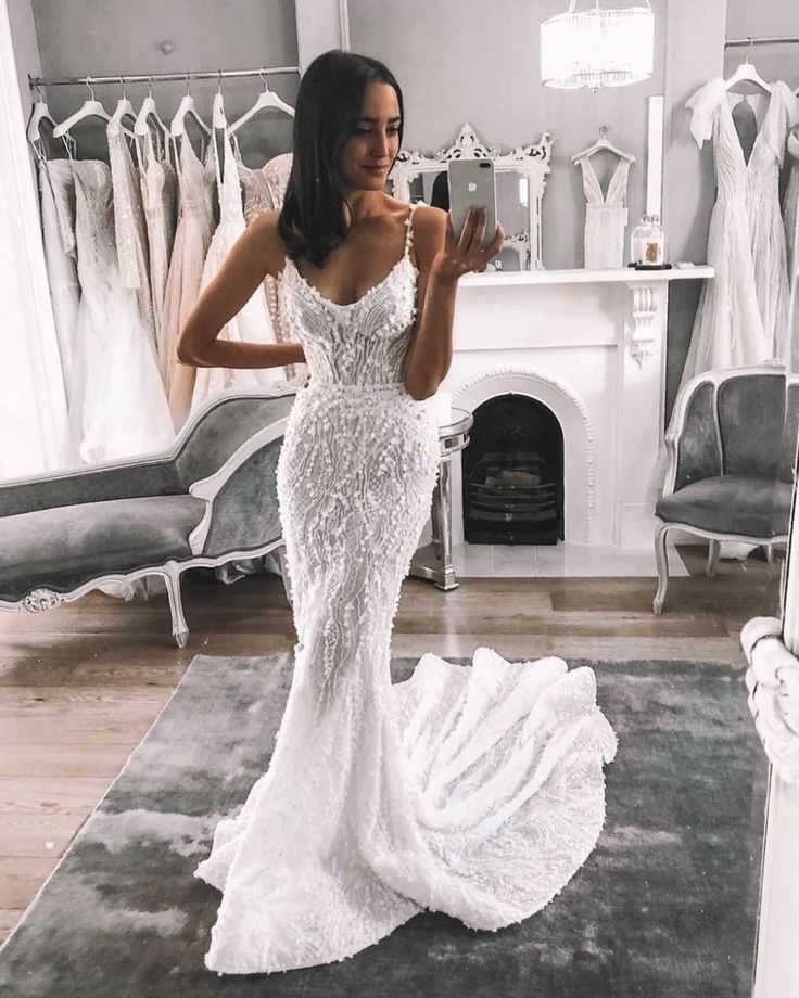 Luxury Mermaid V Neck Spaghetti Straps Lace Wedding Dresses