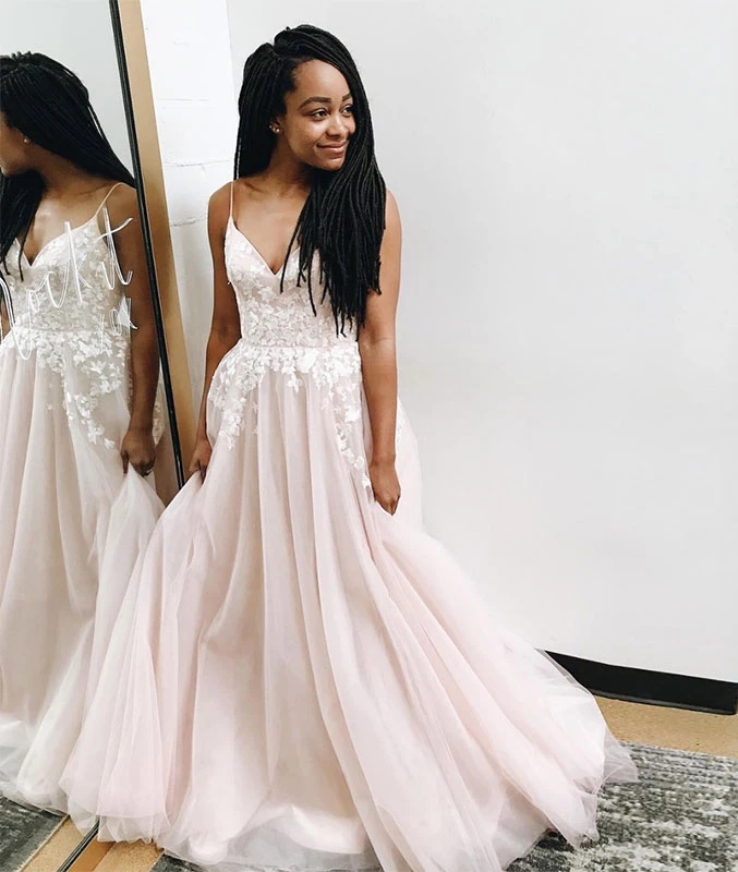 A-Line V Neck Blush Pink Tulle Lace Wedding Dresses