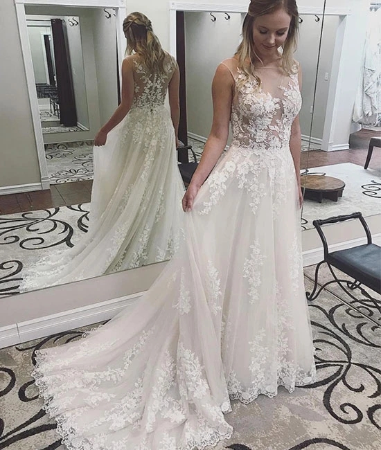 A-Line Boat Neck White Tulle Lace Beach Wedding Dresses
