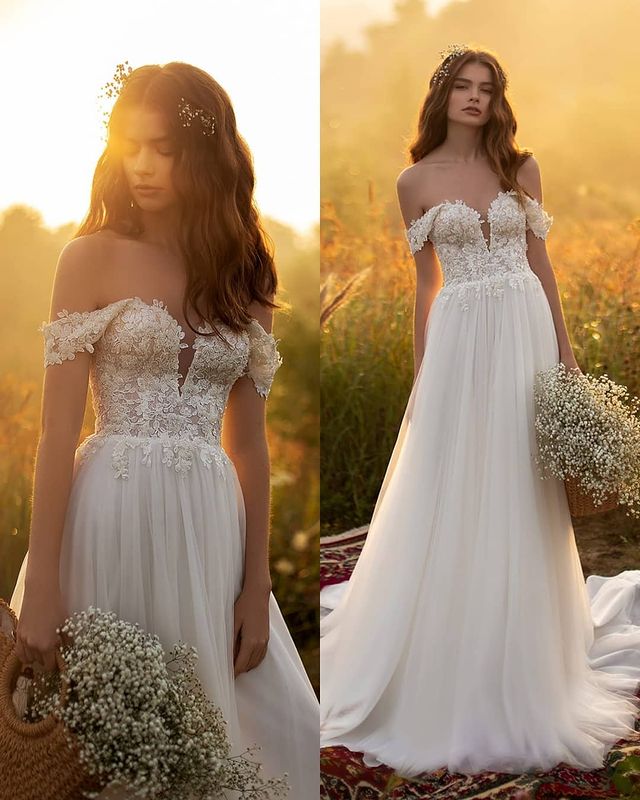 Fairy A Line Sweetheart Off the Shoulder Tulle Wedding Dresses with Appliques