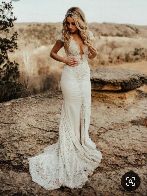 Chic Mermaid V Neck Cap Sleeve lace Wedding Dress