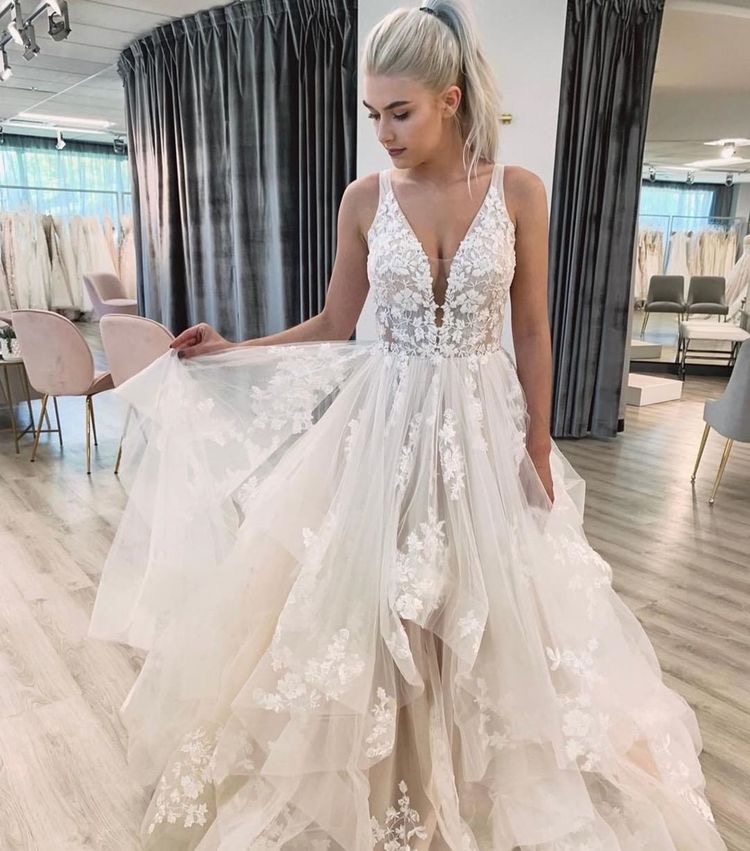 V Neck Wedding Dresses Bridal Gown with Appliques Lace
