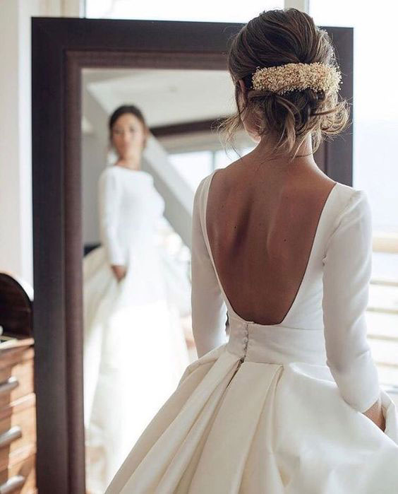 Elegant White Backless Wedding Dress Bridal Gowns with Long Sleeves