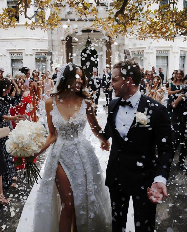 Romantic A-Line V Neck White Wedding Dresses with Side Slit