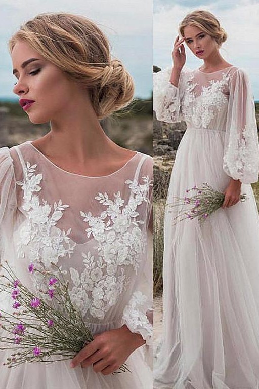 Fairy A-Line Long Sleeve Tulle Spring Boho Wedding Dresses with Lace Appliques