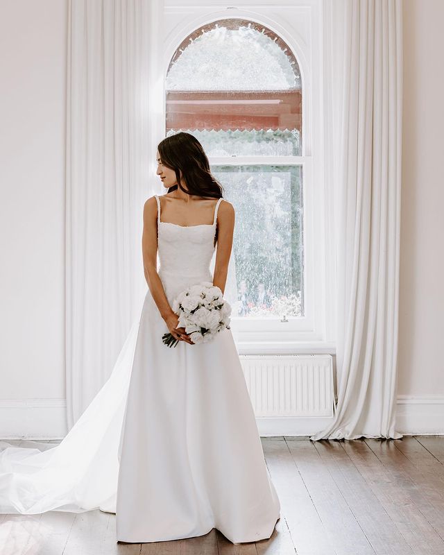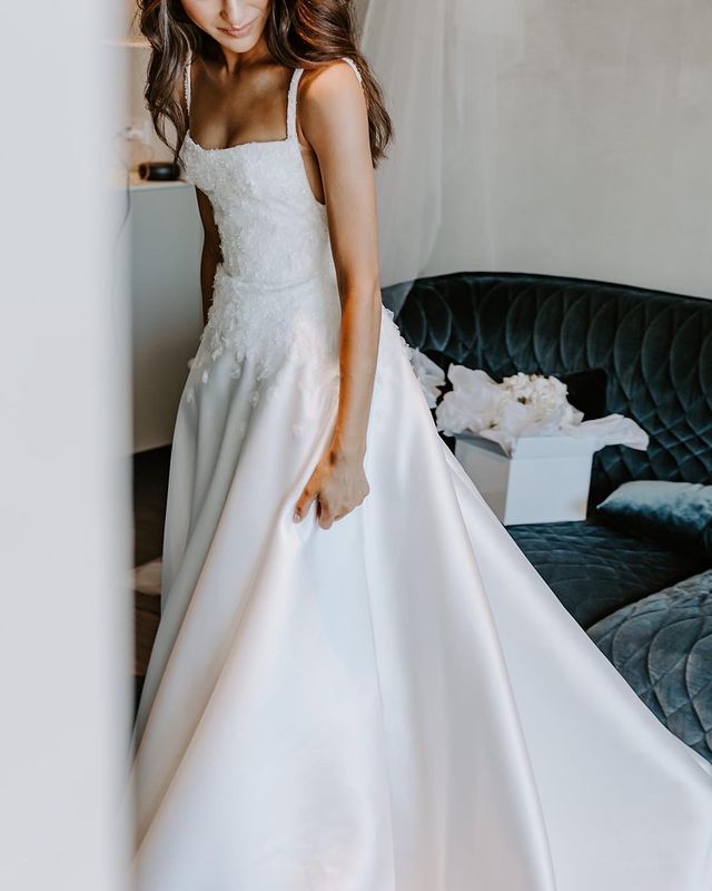Gorgeous A-Line Square Neck White Satin Wedding Dresses with Lace Appliques ABWD0529011