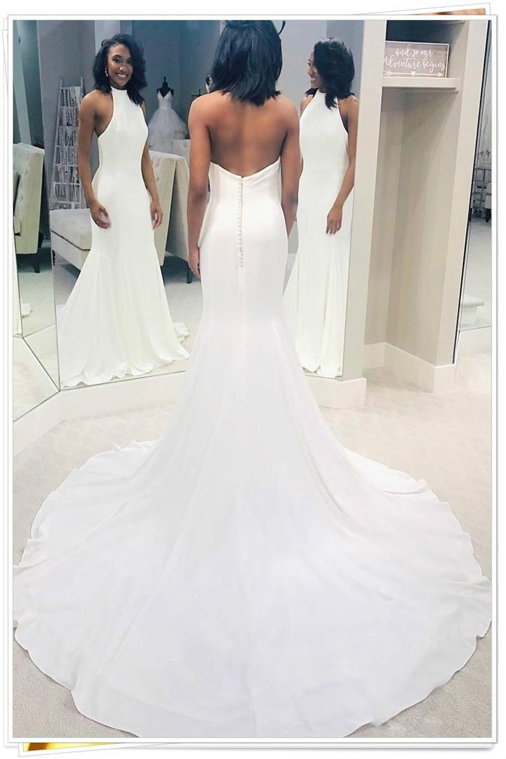 Simple Mermaid Halter Backless White Satin Wedding Dresses