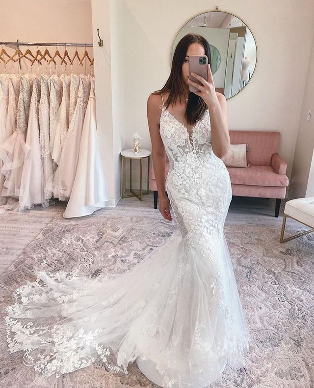 Charming Mermaid V Neck Tulle Lace Wedding Dresses with Train