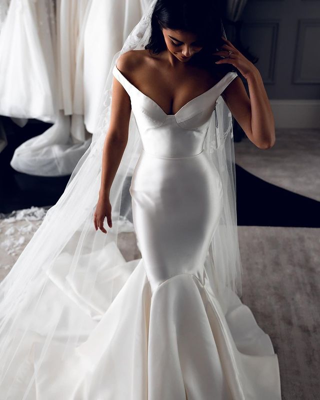 Chic Mermaid Off the Shoulder White Satin Wedding Dresses