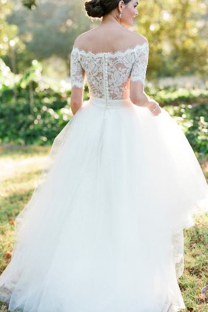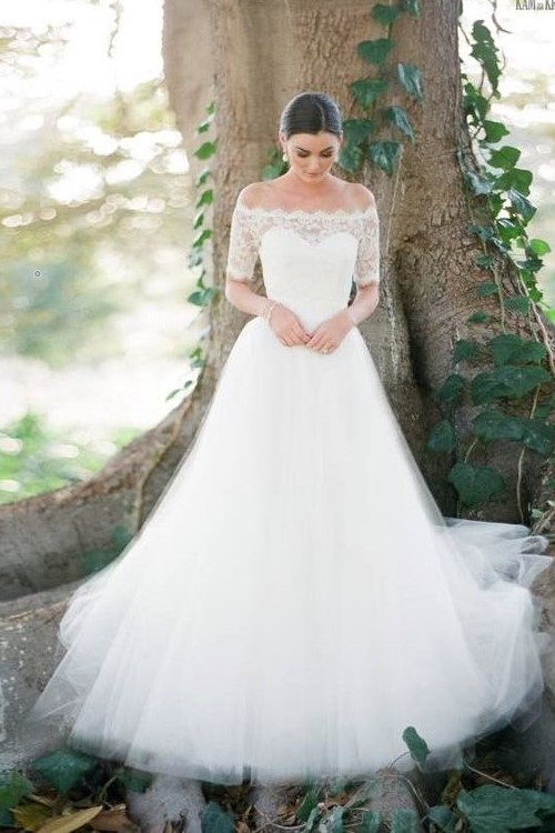 Elegant A-Line Off the Shoulder Lace Sleeves Tulle White Wedding Dresses