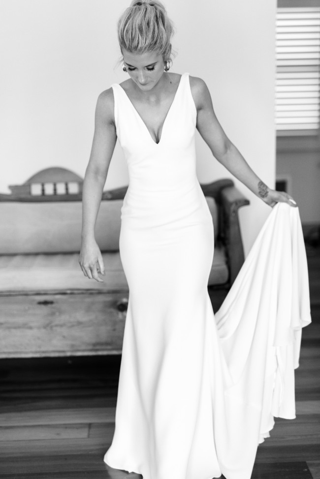 Simple Mermaid V Neck White Soft Satin Wedding Dresses