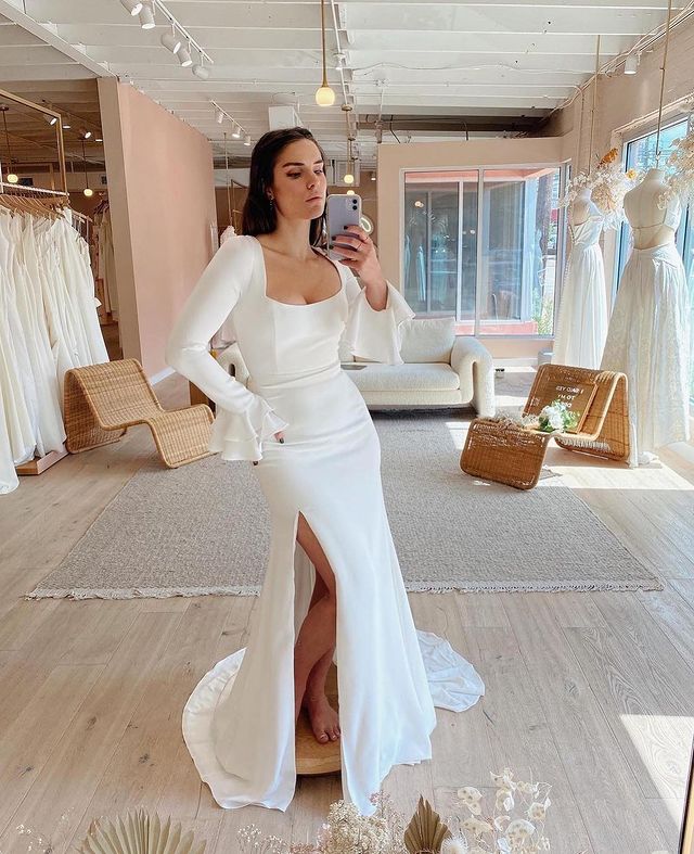 Elegant Mermaid Square Neck Long Sleeve White Satin Wedding Dresses with Side Slit