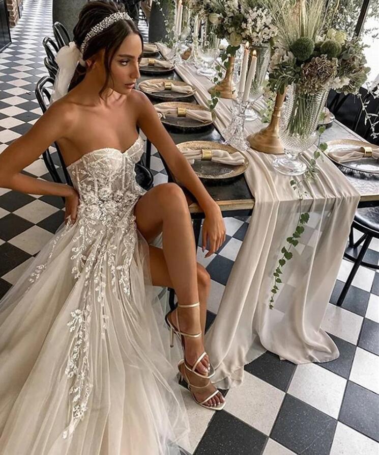 Beautiful A-Line Strapless Sweetheart Tulle Wedding Dresses with Lace Appliques