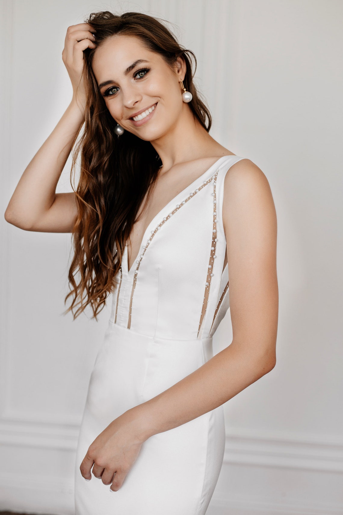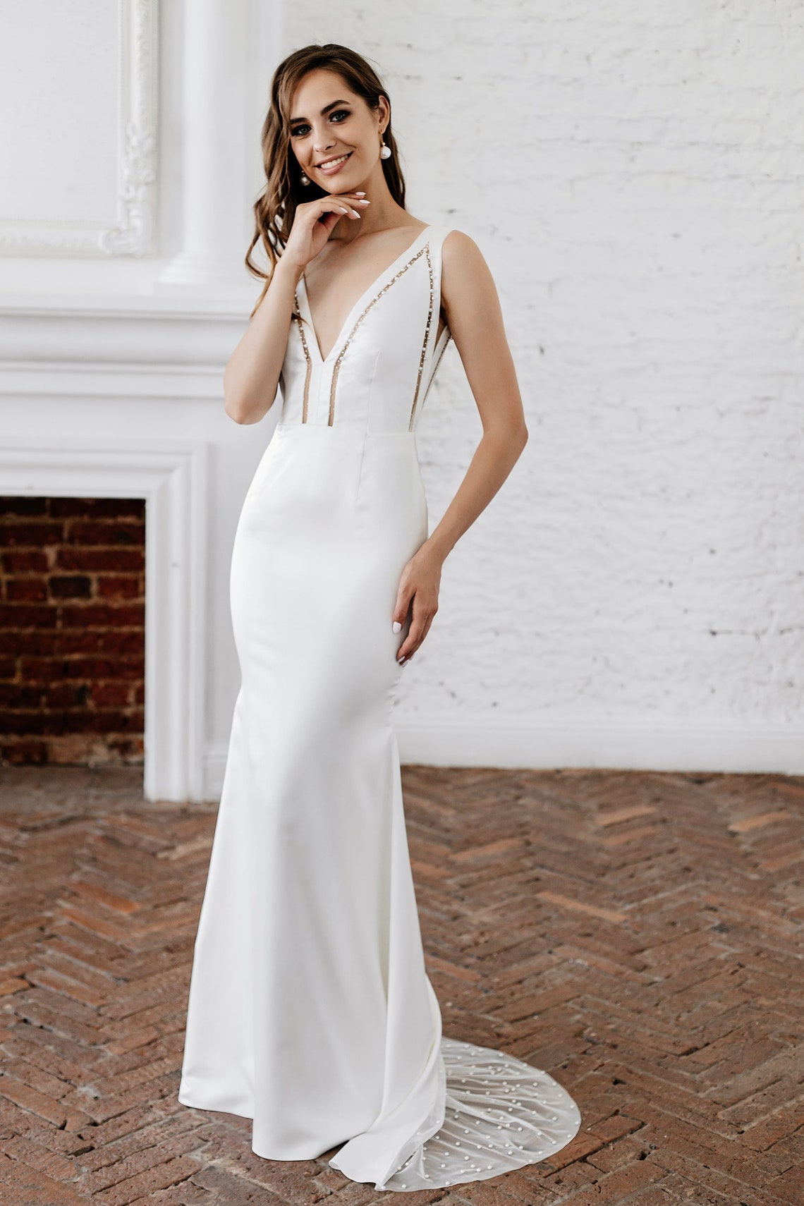 Features:Elegant Mermaid Satin V Neck Wedding Dresses with Pearl Beading