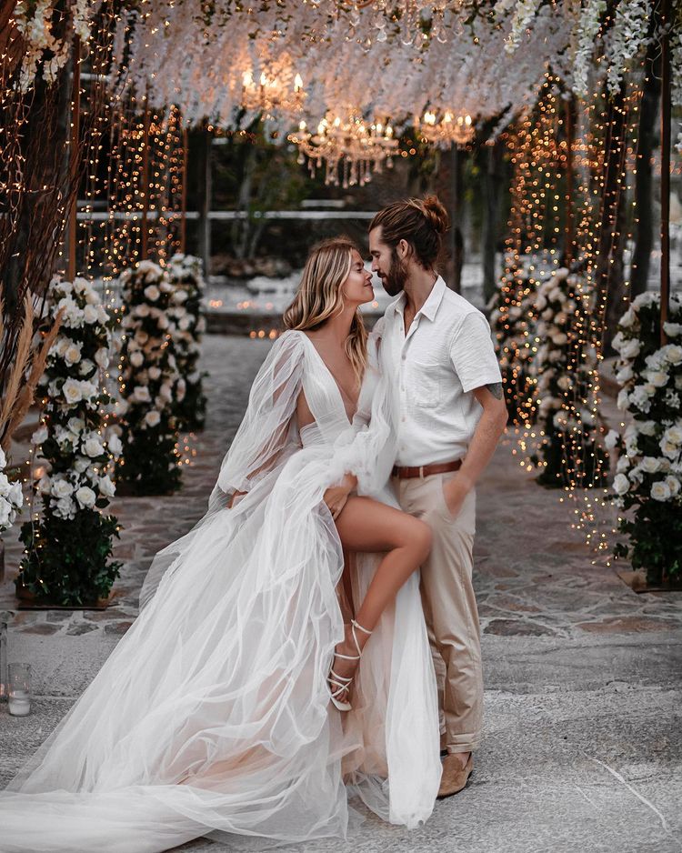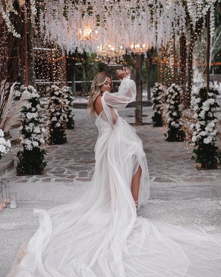 Features:V Neck Long Sleeve Tulle Wedding Dresses with Slit
