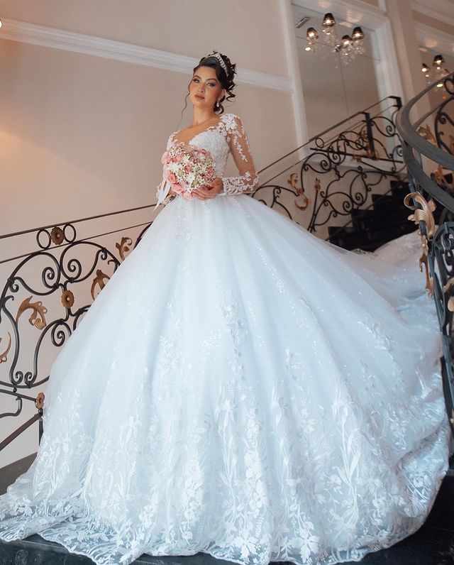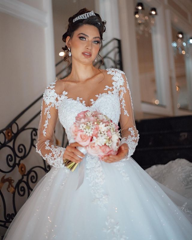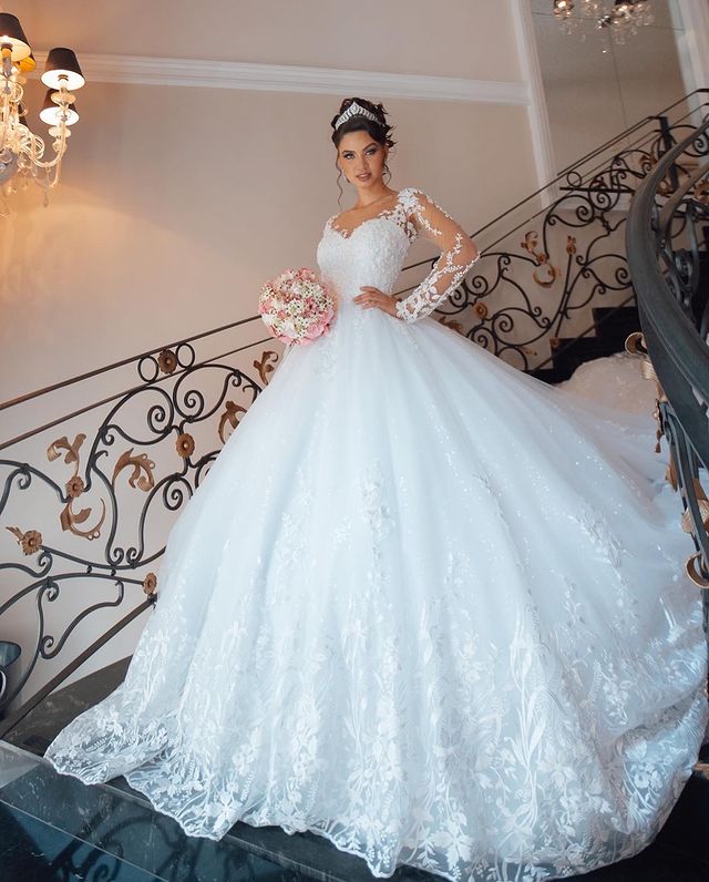 Stunning Ball Gown Long Sleeves White Lace Tulle Wedding Dress, Bridal Gowns