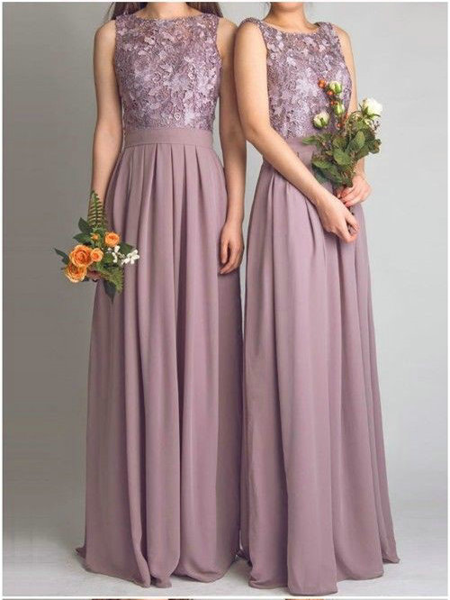 A-Line Round Neck Purple Chiffon Long Bridesmaid Dresses with Lace