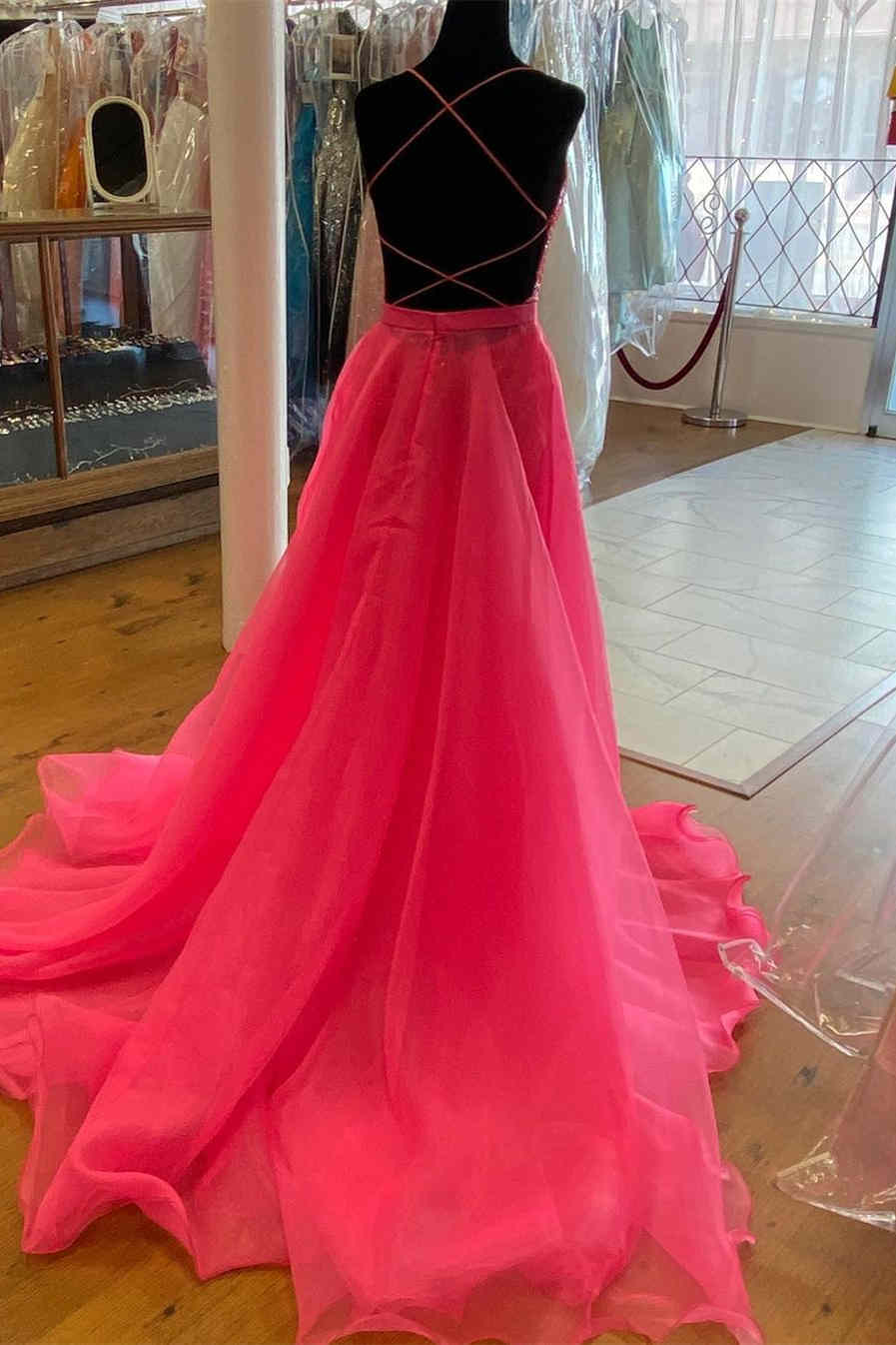 Hot Pink Mermaid Sequin Prom Dresses with Detachable Train