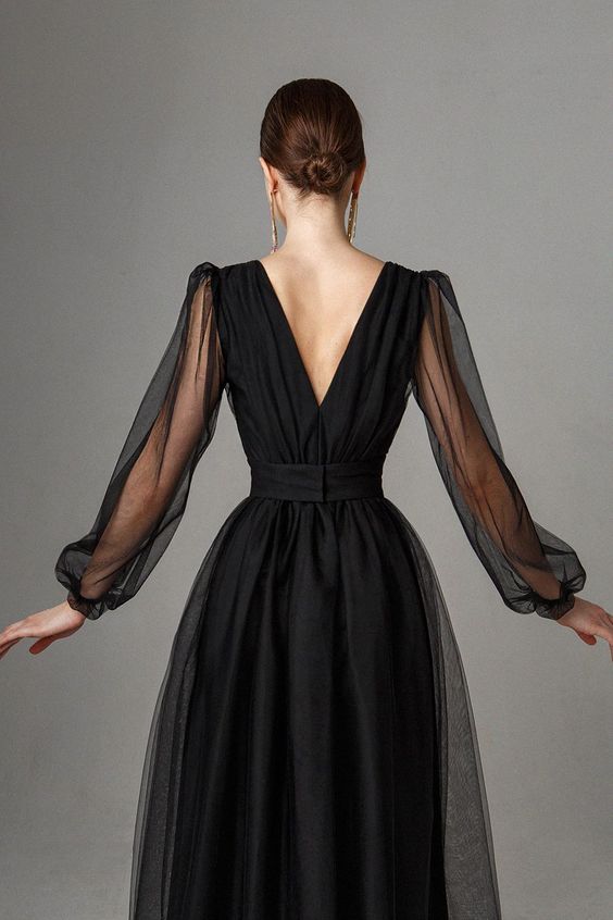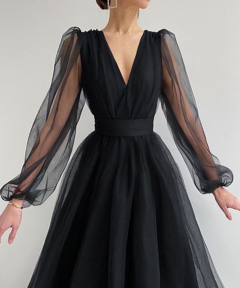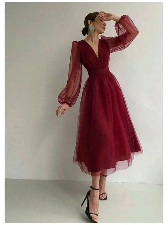 Gorgeous A-Line V Neck Long Sleeves Burgundy Black Tulle Tea Length Prom Evening Dresses