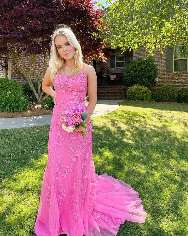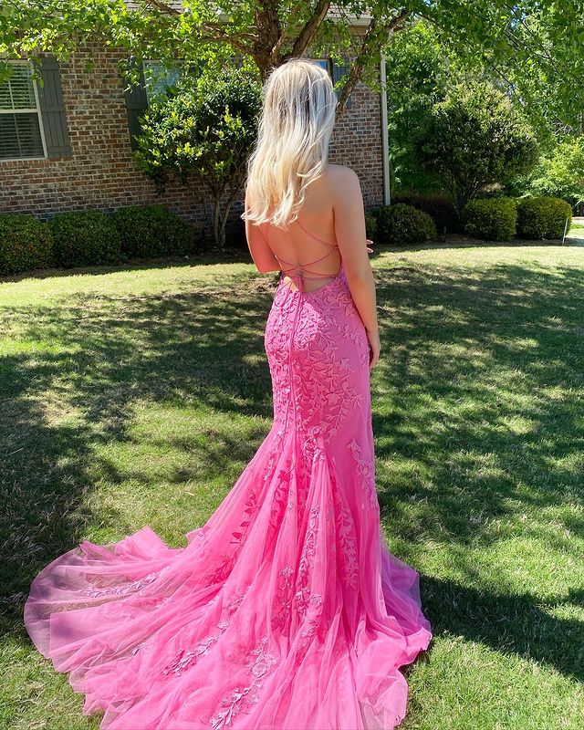 Elegant Mermaid Scoop Neck Cross Back Pink Lace Long Prom Dresses with Cross Back