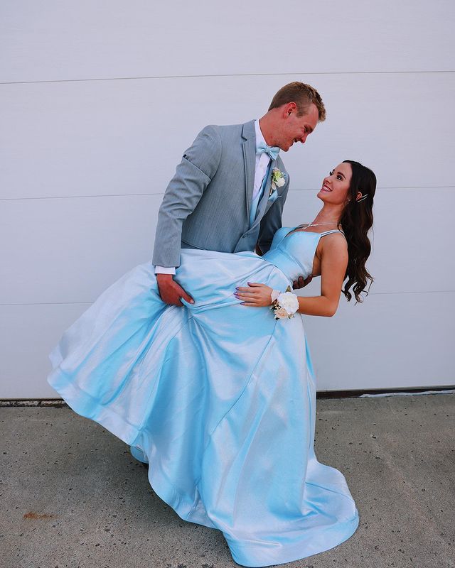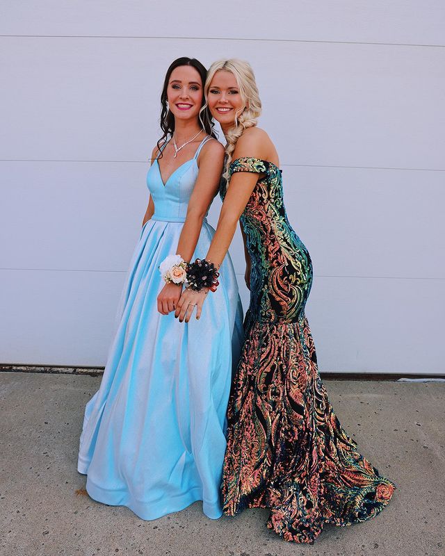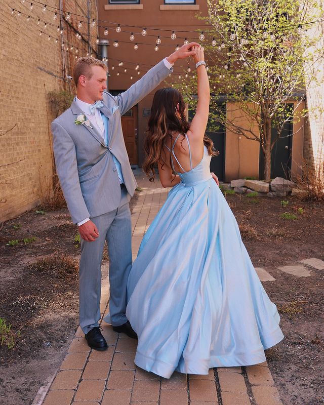 Charming A-Line V Neck Cross Back Sky Blue Long Prom Dresses
