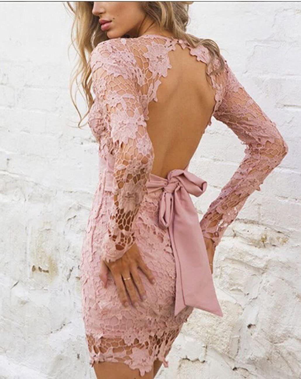Bodycon V Neck Long Sleeve Pink Lace Short Prom Evening Dresses Hoco Dresses