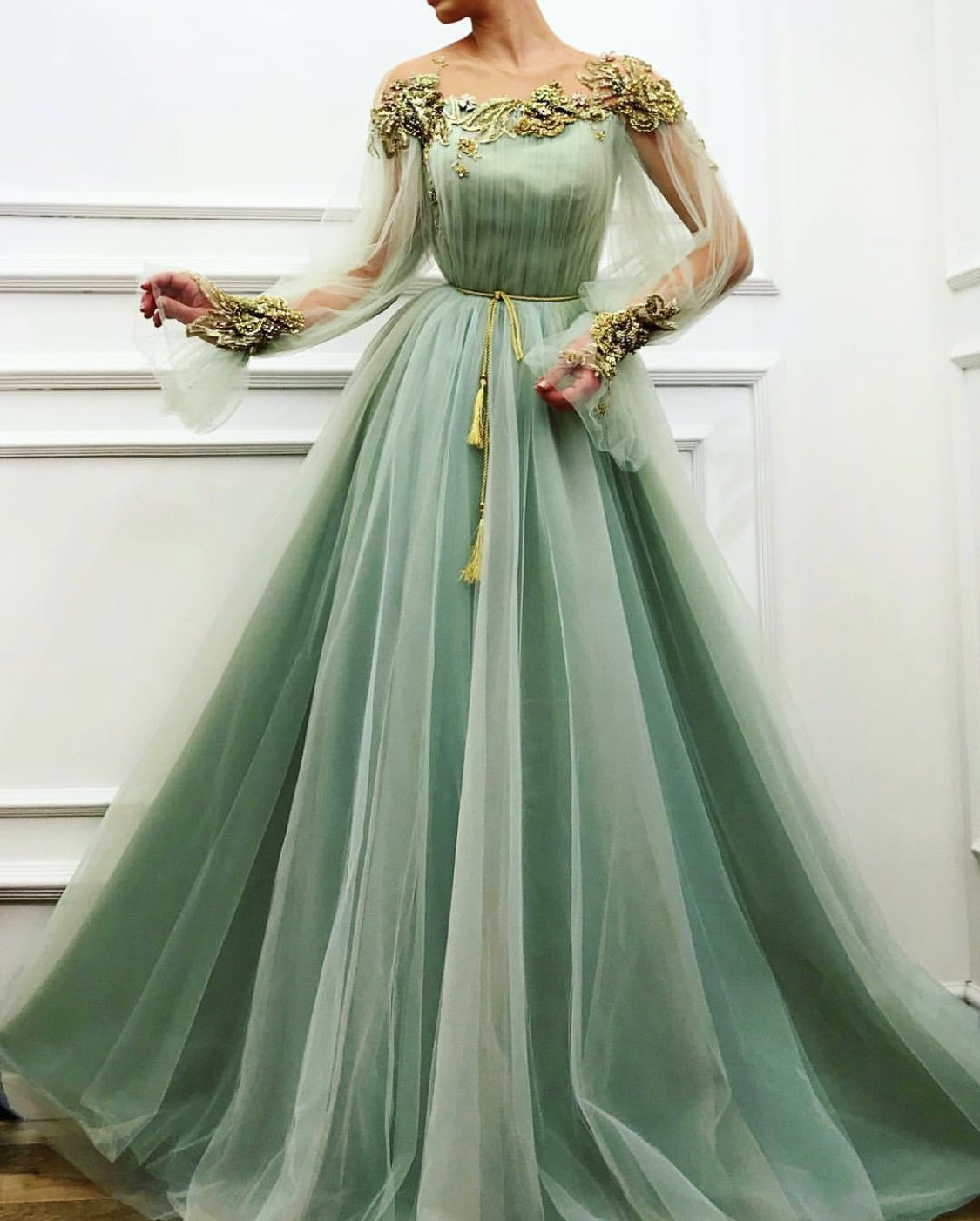 Princess Sheer Neck Long Sleeve Sage Tulle Long Prom Dresses with Appliques