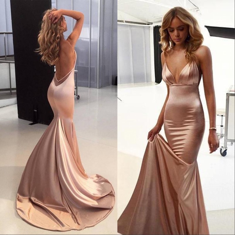 Sexy Mermaid Spaghetti Straps Blush Satin Long Prom Evening Dresses