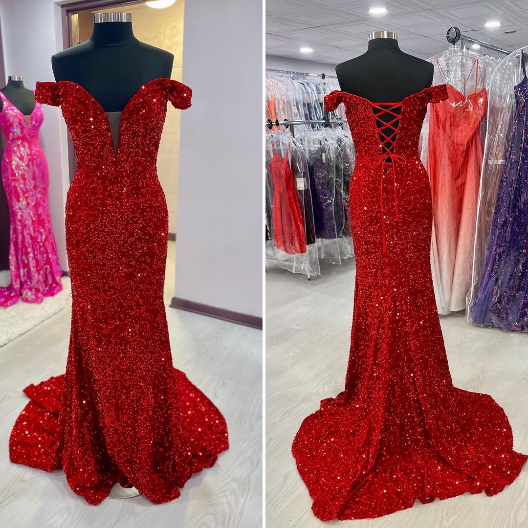 Sparkly Mermaid Off the Shoulder Sequins Red Prom Dress
