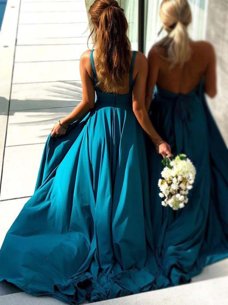 Elegant A-Line V Neck Peacock Blue Bridesmaid Dresses Prom Gown Under 100 with Side Slit