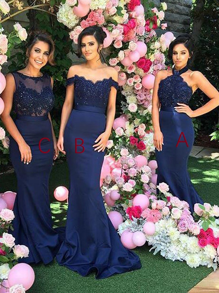 Charming Mermaid Off the Shoulder Navy Blue Long Bridesmaid Dresses with Appliques