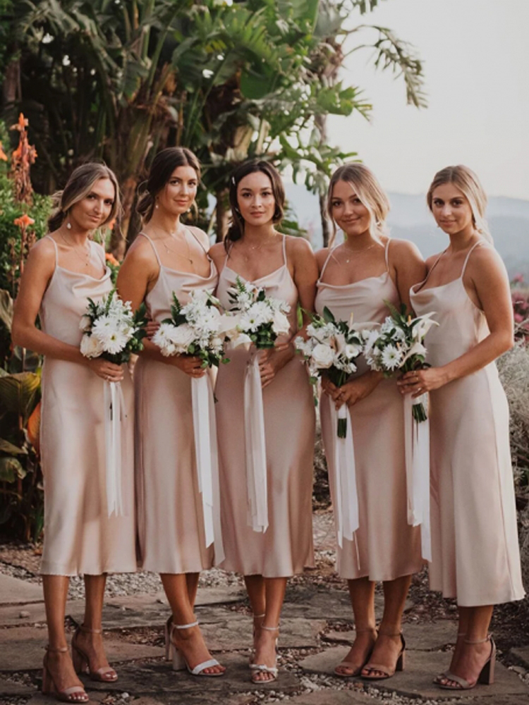 Simple Sheath Cowl Neck Champagne Silk Satin Midi Length Bridesmaid Dresses Under 100 ABB008