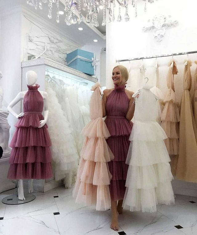 Pretty Prom Dresses A-Line High Neck Tulle Tier Ankle Length Formal Party Dresses
