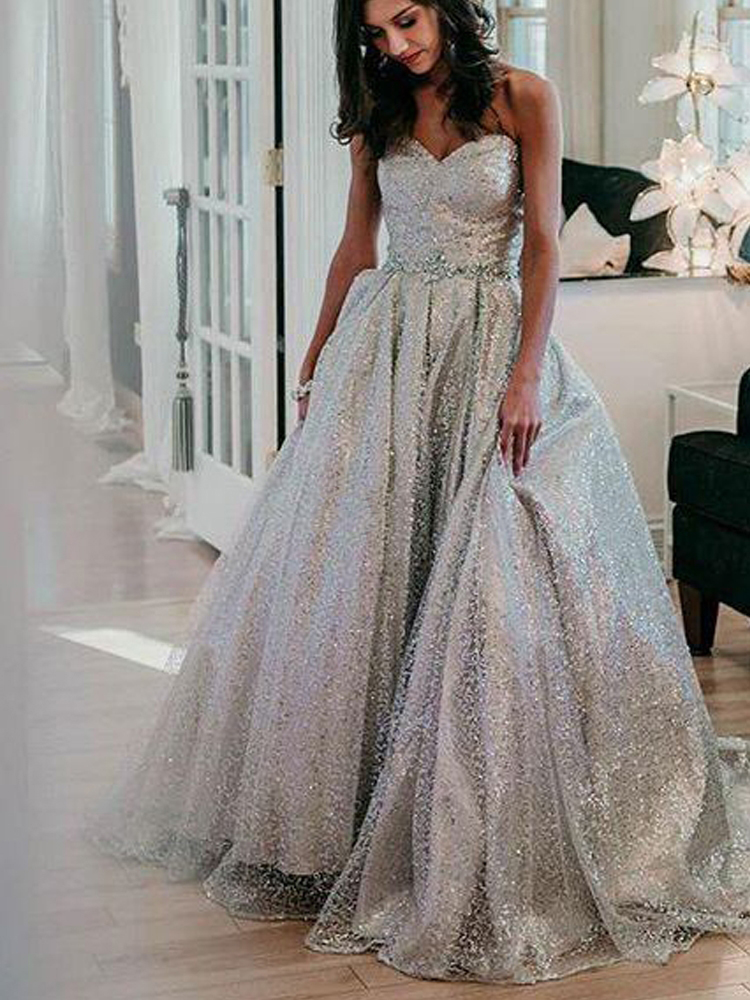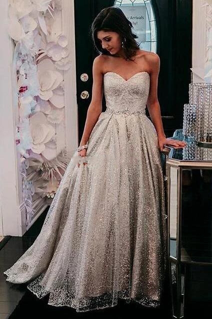 Sparkly Silver Prom Dresses Ball Gown Sweetheart Sequins Formal Evening Party Dresses