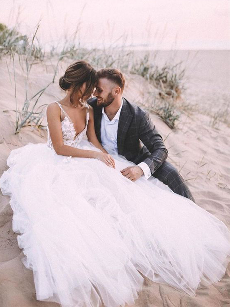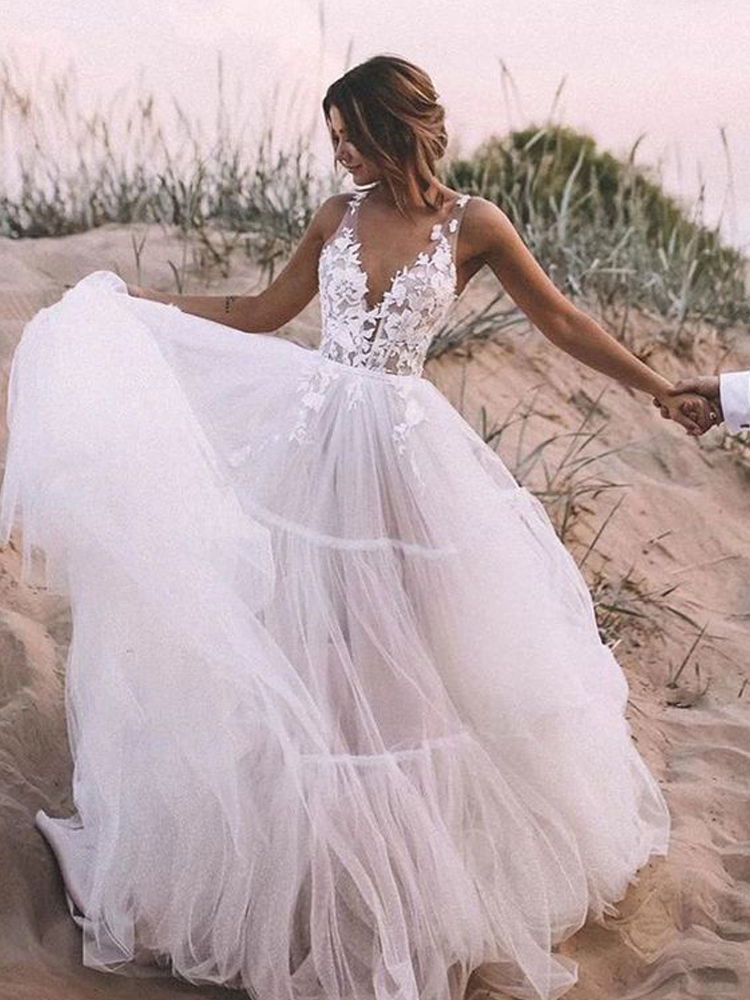 Chic A-Line Floral Lace V-neck Outdoor Wedding Dress Tulle Skirt