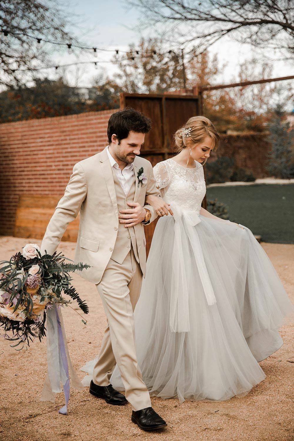 Dusty Tulle Lace Short Sleeves Wedding Dresses with Sash