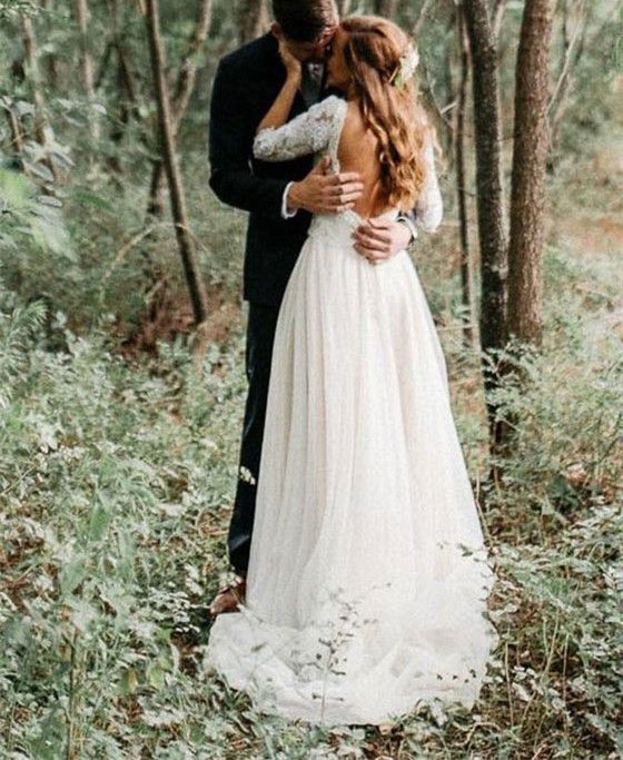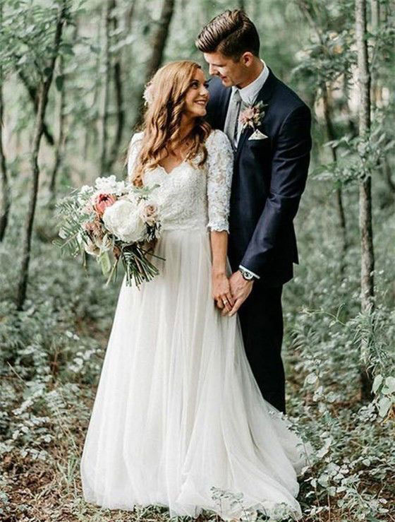 V Neck Half Sleeves Long Backless Wedding Dresses with Appliques Lace