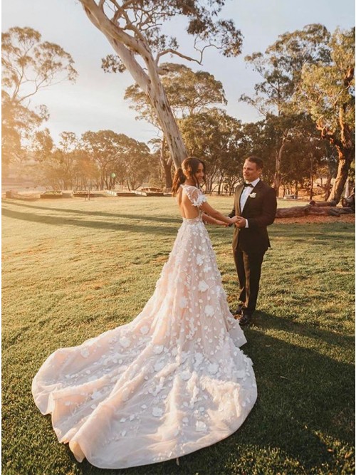 A-line V-Neck Cap Sleeves Sweep Train Wedding Dress With Appliques