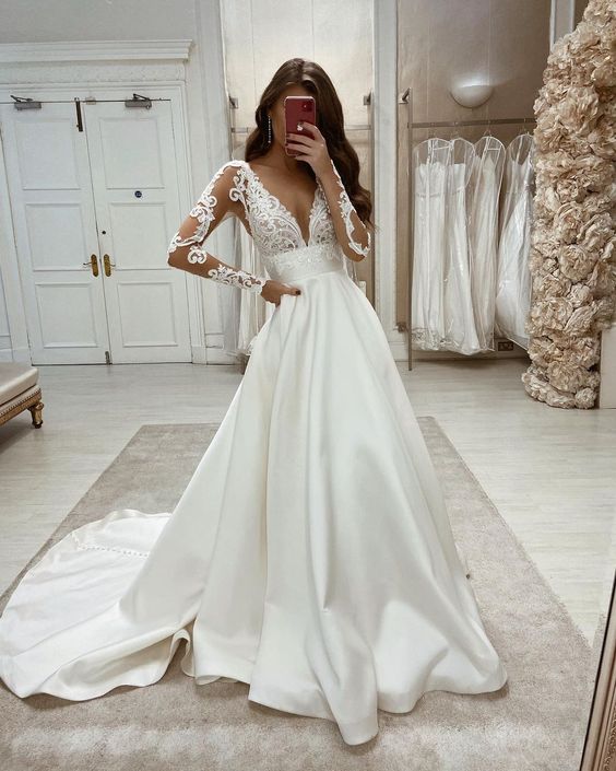 Features:V Neck Long Sleeves Satin Wedding Dresses