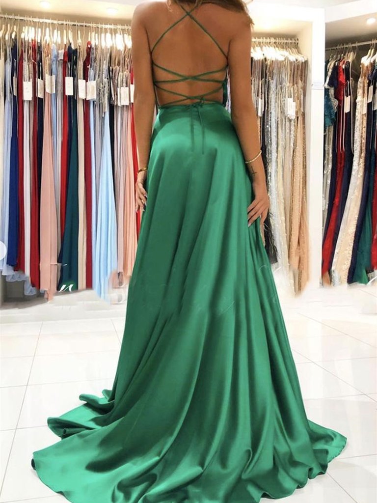 A Line V Neck Spaghetti Straps Cross Back Green Satin Slit Prom Dress Under 100 with Pockets