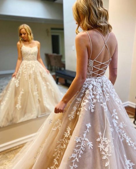 Cute Ball Gown Scoop Neck Straps Champagne Prom Dresses with Appliques