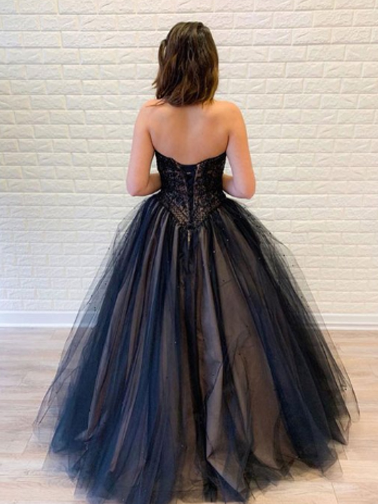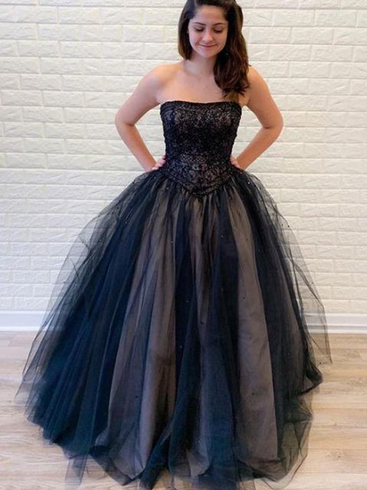 Cute Ball Gown Strapless Black Tulle Prom Dresses with Appliques