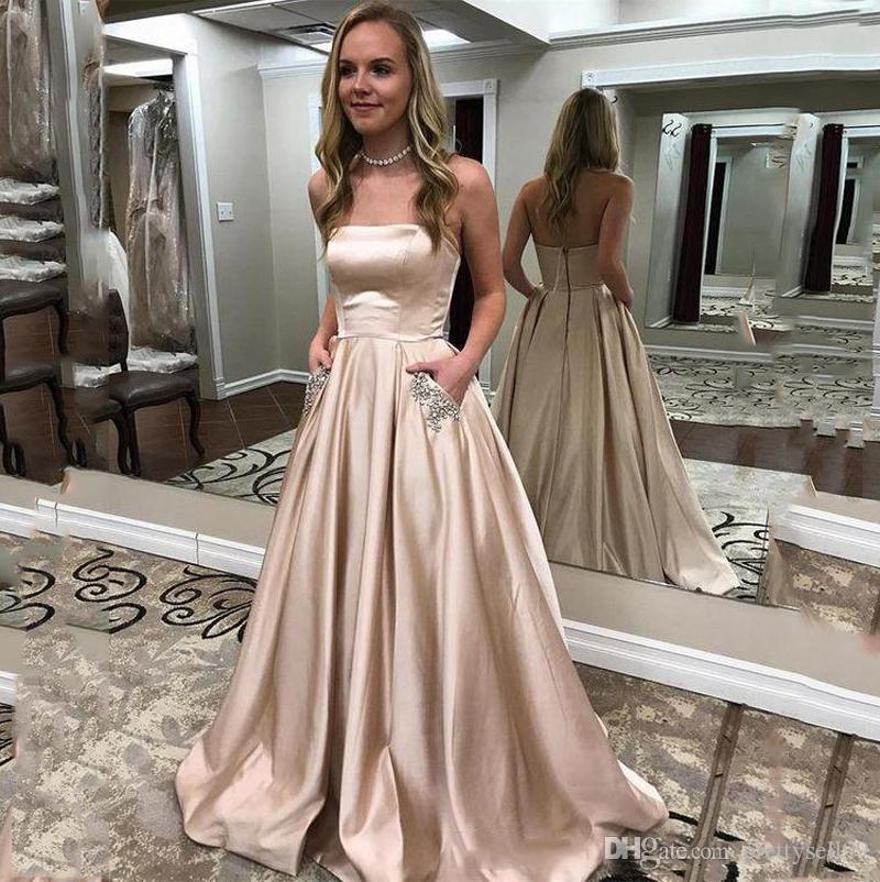 Ball Gown Strapless Champagne Satin Long Prom Dresses with Pockets Beading Prom Gowns