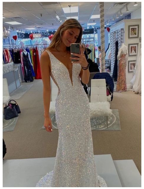 Charming Mermaid V Neck Sequins White Long Prom Dresses