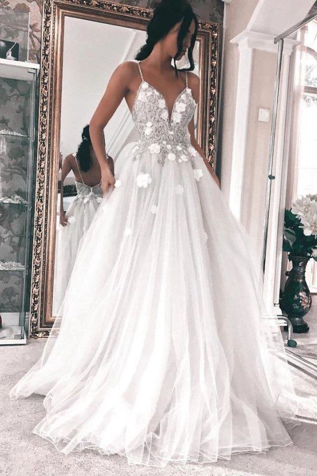 Ball Gown V Neck Spaghetti Straps Tulle Wedding Dresses with Beading